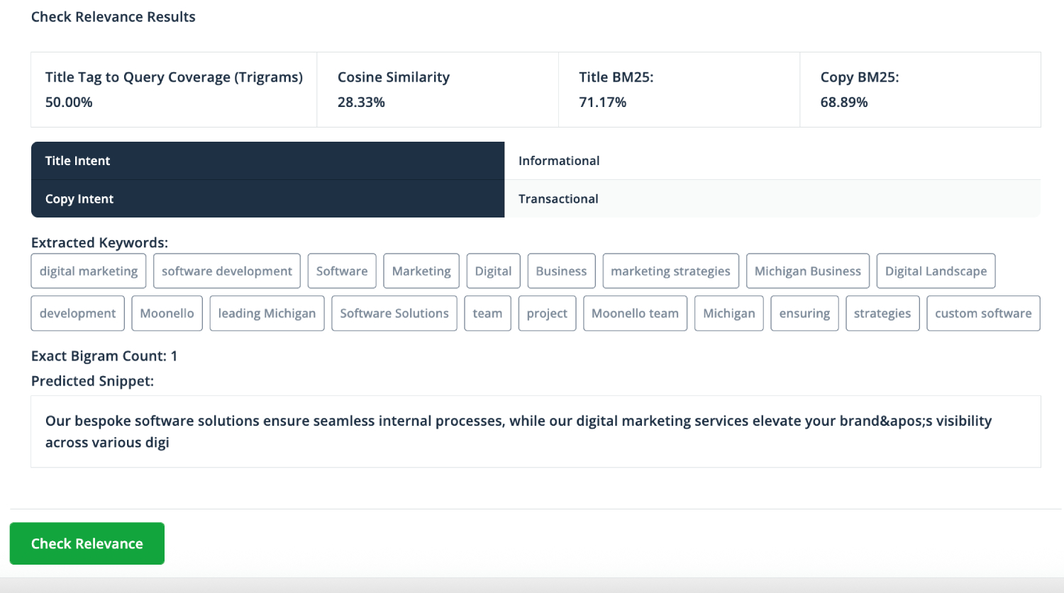 Edit your copy and see how semantic relevance scores change. See what keywords a search engine will see, and even predict your result snippet. Know what will rank BEFORE you post it.