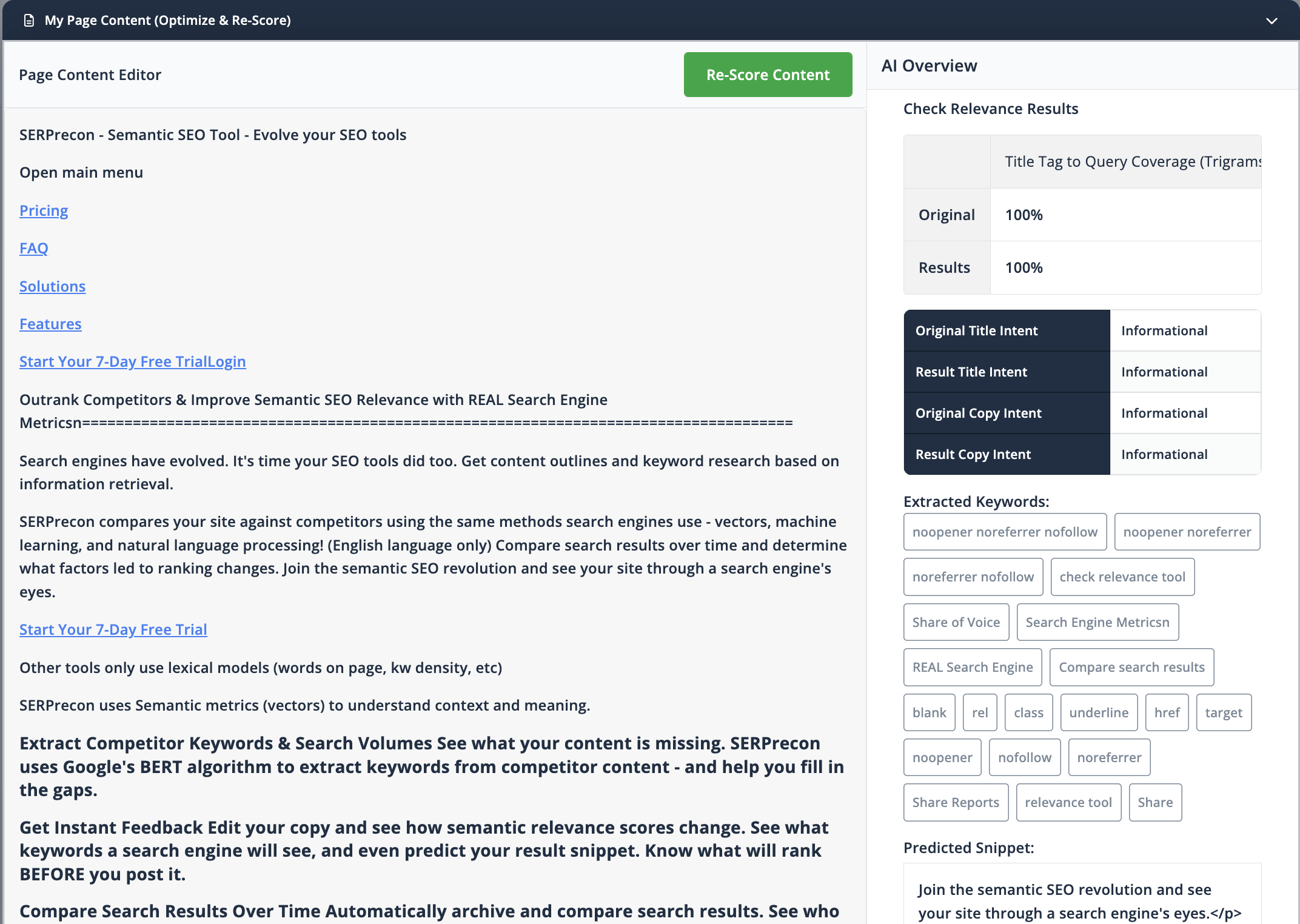 Our keyword and gap analysis will tell you exactly what keywords to add to your copy - and our check relevance tool can help you quickly measure the relevance of those changes to see how your scores change! Edit with markdown within SERPrecon!