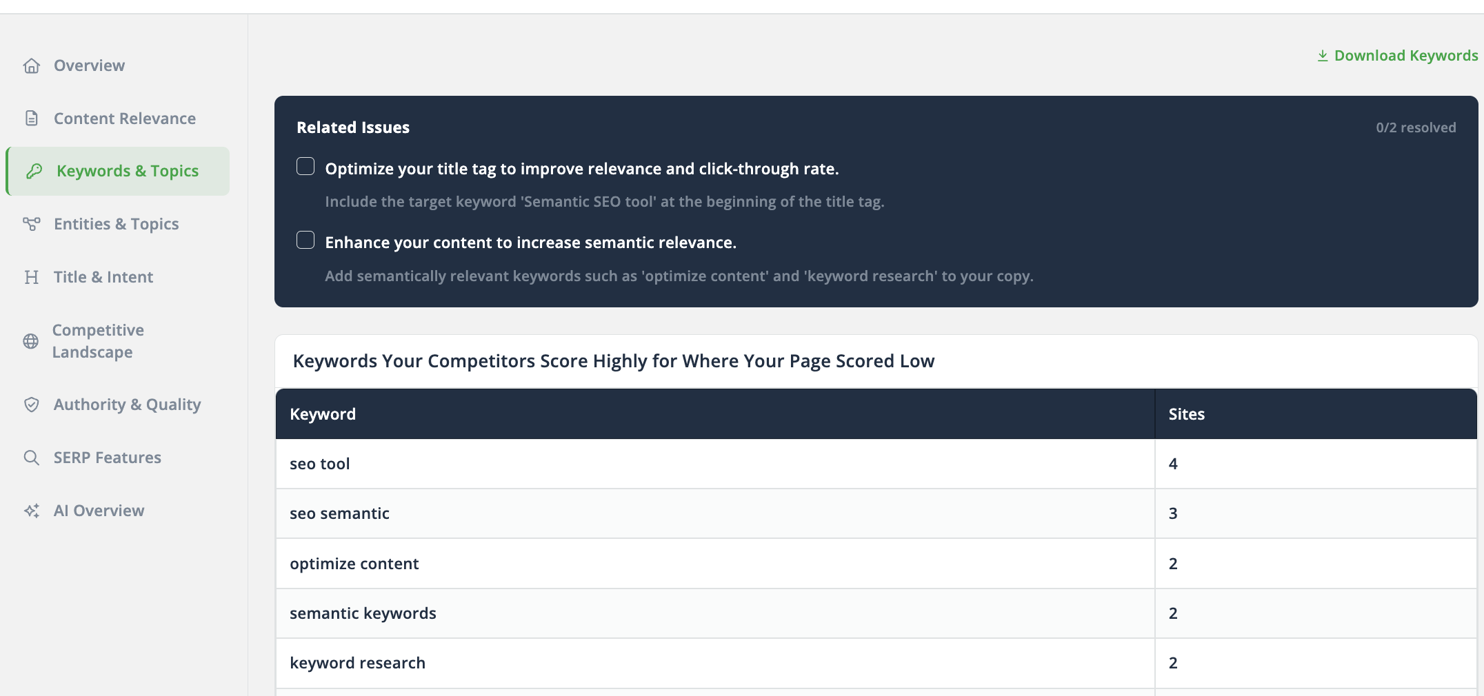 Feed all of our data points and competitive information into AI to create the perfect content outline for dominating search results. Let AI help you understand the data. Get an actionable next steps checklist to improve your SEO.